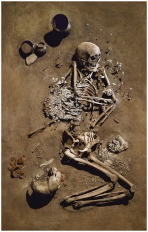 The dead were generally buried singularly in low flat Graves, sometimes with a low mound raise over it sometimes without. Men were generally buried on their right side with their head facing West and their face to the South with their knees bent. Women were usually buried on their left side with their head facing East And their face to the South. Though in some Polish graves, the bodies were buried with their heads facing South, women on their right side, looking East, men on their left side, looking West. Men were usually buried with axes laid near their face and a knife at their hip, Occasionally they were buried with pottery behind their head (in which case an axe is usually not present). Wagons, animals, beakers, flint blades, amber beads, copper tools, and shell ornaments are also found as grave goods. | [[File:Corded Ware Burial.jpg|thumb|Burial including gravegoods]] | ||