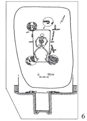Individuals buried in these graves are generally considered to be of higher status, and usually are lying on their back with their knees raised and their head facing east. They are often laying on mats made of reads, sometimes these are painted. The floor and or the body is often covered in red ocher dust. They are generally buried with grave goods such as daggers axes, pestles,flint arrowheads, pottery, knives, animals, and even wagons.The graves are covered with a mound, and these may include rings of stone. The Earthen mounds raised over the graves are generally 30 to 40 foot wide, but can be as wide as 120 foot, and up to 12 foot high.[1][2]